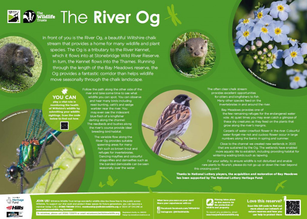 FIN is pleased to have provided a grant to Wiltshire Wildlife Trust (WWT) for channel restoration works on the River Og, a tributary of the Kennet rising on the chalk to the north of Marlborough. 1.3 kilometres of the Og runs through WWT’s newly acquired Bay Meadows nature reserve. The FIN grant supported the purchase of materials used by WWT staff and volunteers to install live willow structures to diversify flows in the river channel and to increase marginal wet woodland habitat. Some of the FIN grant was also spent on an interpretation board informing reserve visitors about the wildlife of the River Og.